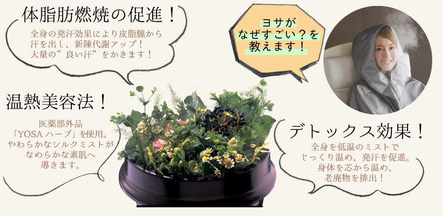 全身美容促進器具として特許を取得しているYOSAチェアー。 全身の発汗効果により皮脂腺からの汗を出し、新陳代謝・体脂肪燃焼の促進、老廃物の排泄を促します。 さらに温熱効果で身体を芯から温め、厳選されたハーブを使用したハーブミストを粘膜吸収で体内に取入れることで、 美容・女性特有 の悩み・むくみ・冷えなどの様々なトラブルにアプローチ、効果が期待できます。 美容と健康のための温め潤すトリートメントです。 また、遠赤外線・マイナスイオン放出によるリラックス効果も抜群で、大自然の潤いで癒しを満喫していただけます。