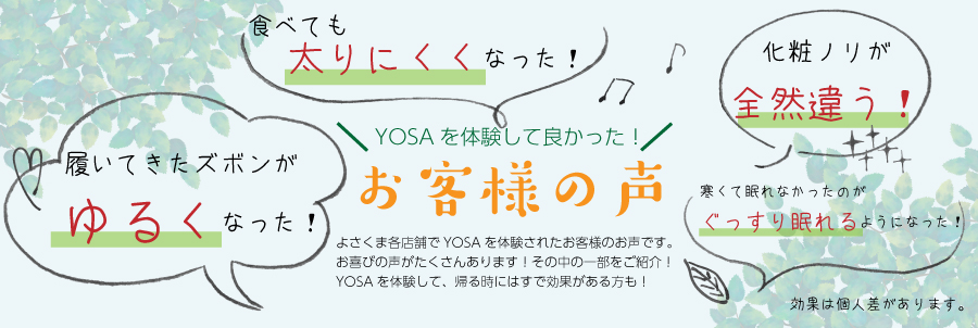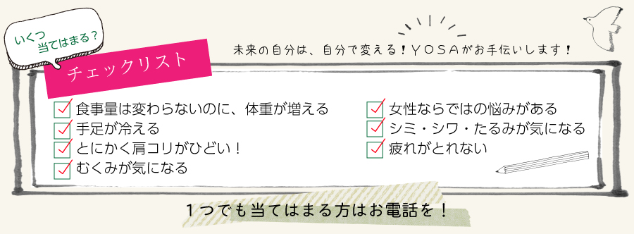 YOSAとは、じっくりゆっくり体(子宮も)が温められることで、新陳代謝を活発にする温熱美容法です。冷えが原因で起こるさまざまな悩みが緩和されます。また、大量の”良い汗”をかくことで、デトックス効果も期待できます。