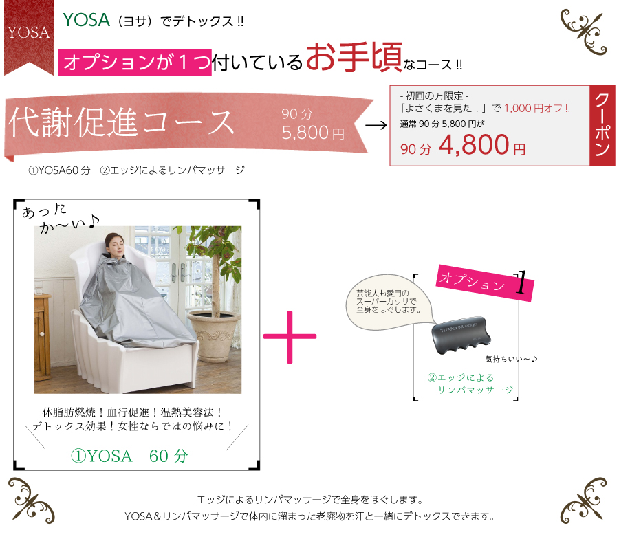 YOSAで楽やせ!!体を芯から温め、新陳代謝UP!!冷え性、肩こり、肌荒れ、便秘、など改善してほしい部分に効果的なのがYOSAの魅力!!びっくりするほどの汗をかくことができます。YOSAを体験すると、スッキリ!!を実感できますよ。